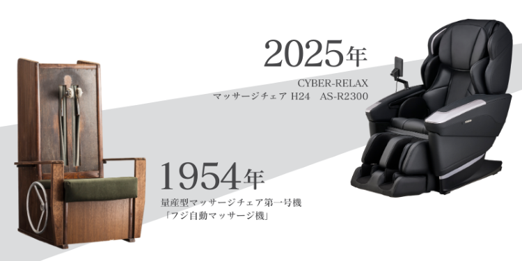 Trong suốt 71 năm tiếp theo, với vai trò là đơn vị tiên phong trong lĩnh vực ghế massage, chúng tôi không ngừng mang đến những sản phẩm giúp xoa dịu mệt mỏi cho đông đảo người dùng. Tháng 3 năm 2025, công ty chính thức ra mắt mẫu ghế massage cao cấp và tiên tiến nhất hiện nay – CYBER-RELAX Massage Chair H24 AS-R2300.