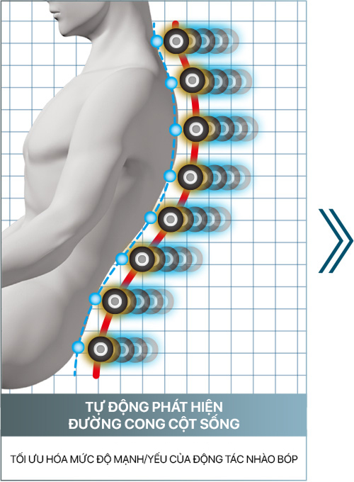Dựa trên đường cong lưng đã được phát hiện, máy sẽ thực hiện massage đồng đều từ vai đến mông. Ngoài ra, có thể điều chỉnh độ mạnh của động tác xoa bóp cho từng bị trí trong số 8 khu vực trên lưng