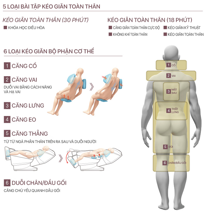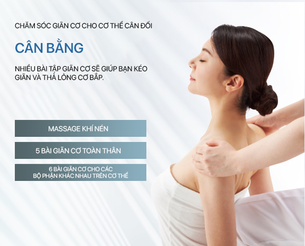Với các chế độ kéo giãn phong phú như “Conditioning” kéo giãn toàn thân trong 30 phút hay 6 chế độ kéo giãn riêng từng vùng, giúp kéo giãn và làm mềm các nhóm cơ hiệu quả.