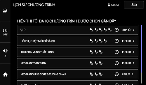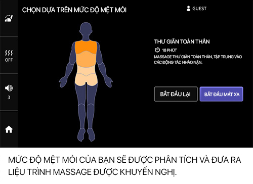 Với thao tác trực quan trên màn hình cảm ứng cỡ lớn, người dùng chỉ cần chạm vào vùng cơ thể đang mệt mỏi, hệ thống AI sẽ phân tích và đề xuất chương trình phù hợp thông qua mục “Chọn theo mức độ mệt mỏi”. Ngoài ra còn có các mục “Chọn theo mục đích”, “Lịch sử sử dụng”, giúp tìm ra chương trình lý tưởng phù hợp với tình trạng cơ thể của từng người, mang đến trải nghiệm massage đầy cảm xúc.