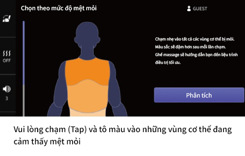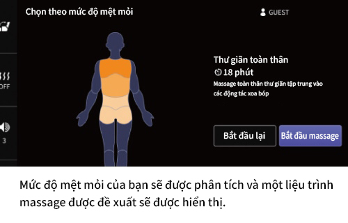 Với màn hình cảm ứng lớn và thao tác trực quan, người dùng chỉ cần chạm chọn vùng cơ thể đang mệt mỏi, AI sẽ phân tích và đề xuất liệu trình phù hợp thông qua tính năng “Chọn theo mức độ mệt mỏi”. Bên cạnh đó, các chế độ như “Chọn theo mục đích” hay “Lịch sử liệu trình” giúp gợi mở những chương trình massage tối ưu, đồng hành cùng tình trạng cơ thể và cảm giác của người dùng, dẫn dắt đến một trải nghiệm massage đầy thư giãn và ấn tượng.