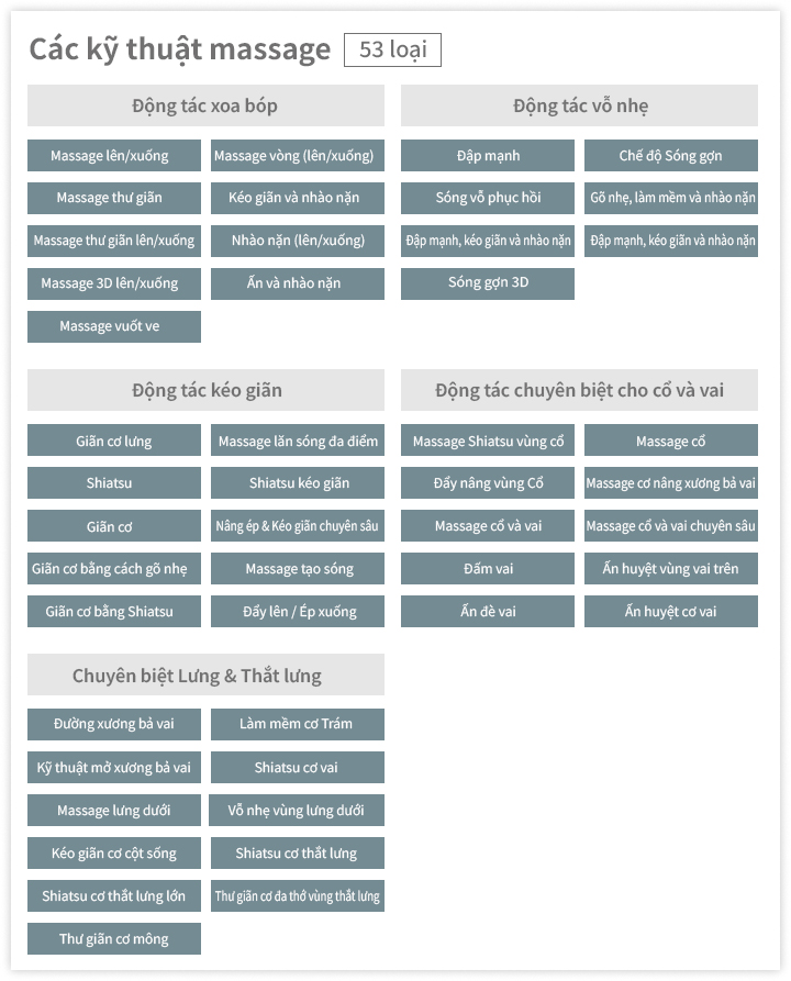 Với 53 kiểu kỹ thuật massage, bao gồm các động tác nhào, day ấn được thiết kế tỉ mỉ cùng chuyển động massage độc quyền, máy tập trung tác động sâu vào những vùng cơ thể cần chăm sóc, mang đến cảm giác thư giãn rõ rệt và dễ chịu.