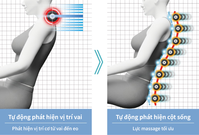 Hệ thống phát hiện vị trí vai xác định chính xác các điểm massage, kết hợp cùng công nghệ nhận diện đường cong chữ S với 8 điểm cảm biến để phân tích đường cột sống. Dựa trên đường cột sống này, 5D-AI Mecha PLUS tự động điều chỉnh lực massage một cách đồng đều, mang đến trải nghiệm massage êm ái, chuẩn xác và dễ chịu cho từng người dùng.