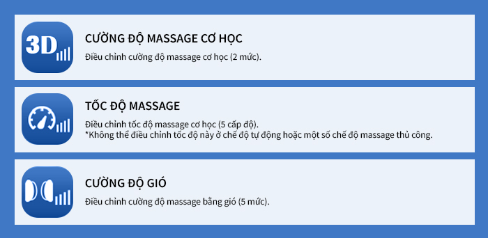 Điều chỉnh lực massage bằng túi khí, mang lại cảm giác ôm sát cơ thể nhẹ nhàng hoặc tác động sâu, mạnh mẽ để giải tỏa hiệu quả các vùng cơ mệt mỏi.