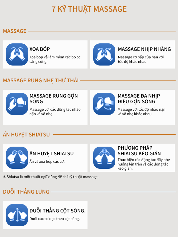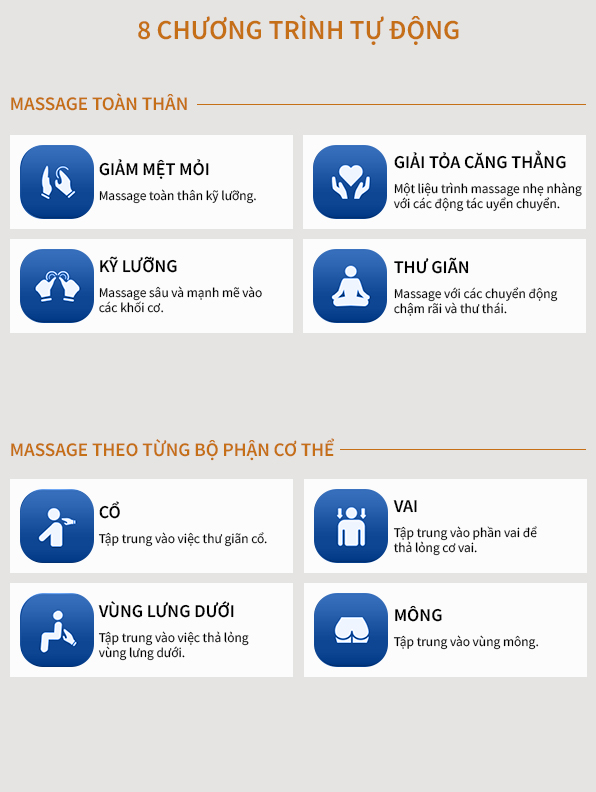 Lựa chọn 8 liệu trình massage toàn thân hoặc theo vùng, kết hợp 7 kỹ thuật như nhào cơ, vỗ nhịp điệu và bấm huyệt, giúp thư giãn và phục hồi cơ thể mỗi ngày.